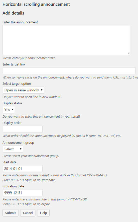 WordPress scripti kullandığınız sitelerde herhangi bir yere (örneğin header altına) kayan yazı eklemek istiyorsanız bu iş için kullanılabilecek en iyi eklentilerden birisiyle karşınızdayım. Horizontal scrolling announcement isimli eklenti ile admin panelden duyuru notlarınızı ekleyebilir, notların sıralamasını ve hangi tarihte yayına girip, hangi tarihte yayından kalkacaklarını ayarlayabilirsiniz.